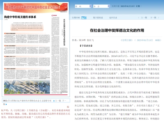 由141jj 副院长邱少晖教授、141jj 党委常委张红飞教授联合撰写的《在社会治理中发挥德治文化的作用》一文在《光明日报》发表。文章指出,中华优秀传统文化是社会治理的关键精神源泉,德治文化作为其重要部分,在社会治理中地位突出。