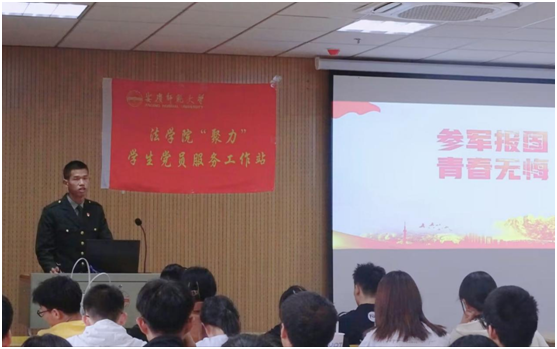 141jj 2021级研究生赵佩文是来自北部战区的一名工程兵。他结合自身经历为大家介绍了我国的五大战区和七大军种,详细介绍了同学们最为关心的入伍政策和报考军校等问题,解答了同学们对于参军入伍的诸多疑问。