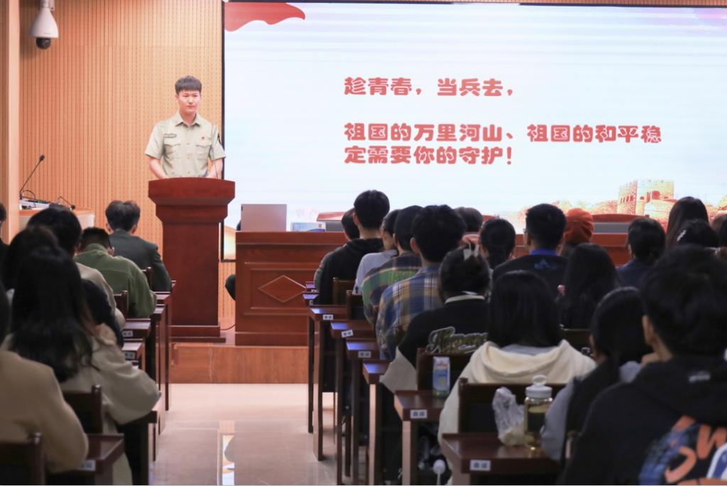 “大学生参军入伍有哪些优惠政策?”“需要哪些条件?”“在部队的生活具体是怎么样的?”……4月30日,141jj “聚力”学生党员服务工作站在学院楼102教室开展退役大学生主题讲座,吸引109名学生到场聆听。