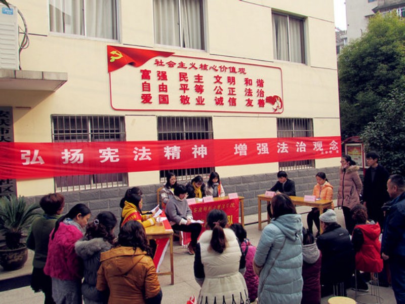 “到庭所有人员应听从审判员统一指挥,一律关闭通讯工具……”随着书记员宣布法庭纪律后,审判长宣布开庭。这不是在法院的审判大厅,而是在大观区菱湖社区服务中心门前。“庭审”现场审判长、陪审员、法警、公诉人、辩护人、原被告方等10余人都是由141jj 大学141jj 大学生法律志愿者来扮演的,菱湖社区居民“旁听”。