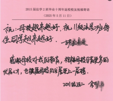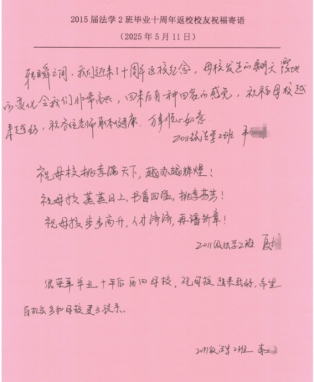 与会校友纷纷发言,回忆了在校学习的点滴时光,畅谈毕业十年间的工作经历与人生感悟。一位校友表示,“这是毕业十年第一次回家,母校的教诲让我始终铭记法律人的责任与担当,十分感谢母校的培养为我们奠定了坚实的职业基础。”校友们结合自身在司法机关、律所以及企业法务岗位的工作经验,围绕法学实践教学、校企协同育人、校友资源共享等提出了宝贵的建议和意见,现场气氛热烈融洽。活动还特别设置了“手写祝福寄语”环节,校友们在明信片上写下对母校的祝愿与对学弟学妹的期许,字字真挚,句句情深。