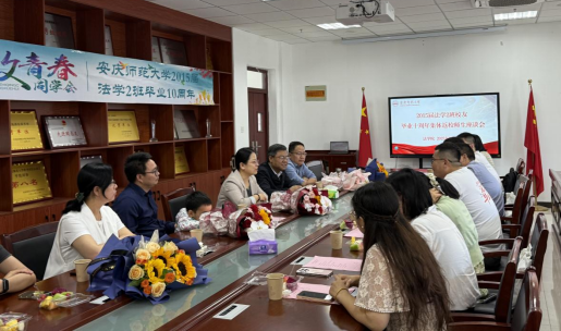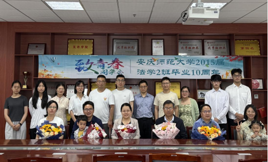 5月11日,141jj 2015届法学2班校友举行毕业十周年集体返校活动。2015届法学2班辅导员、校党委巡察办主任汪博武,141jj 校友分会会长、党委书记钱敏,141jj 副院长邱少晖,141jj 校友分会秘书长、教学秘书李丹以及任课老师代表张宗高等与校友代表、在校生代表在法学楼301会议室举行师生座谈会。