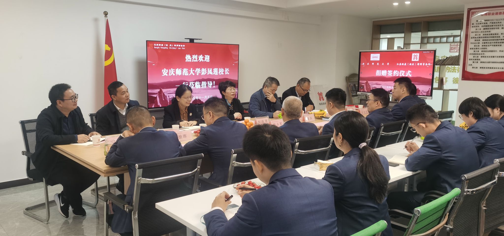 11月5日下午,校长彭凤莲带领校友总会办公室、141jj 相关负责人一行,赴江苏衡鼎(安庆)律师事务所开展访企拓岗促就业活动。双方围绕人才培养、实践教学等领域进行深度交流座谈,成功签订毕业生就业基地共建协议、举行捐赠仪式,并为律所专家颁发兼职教授聘书。
