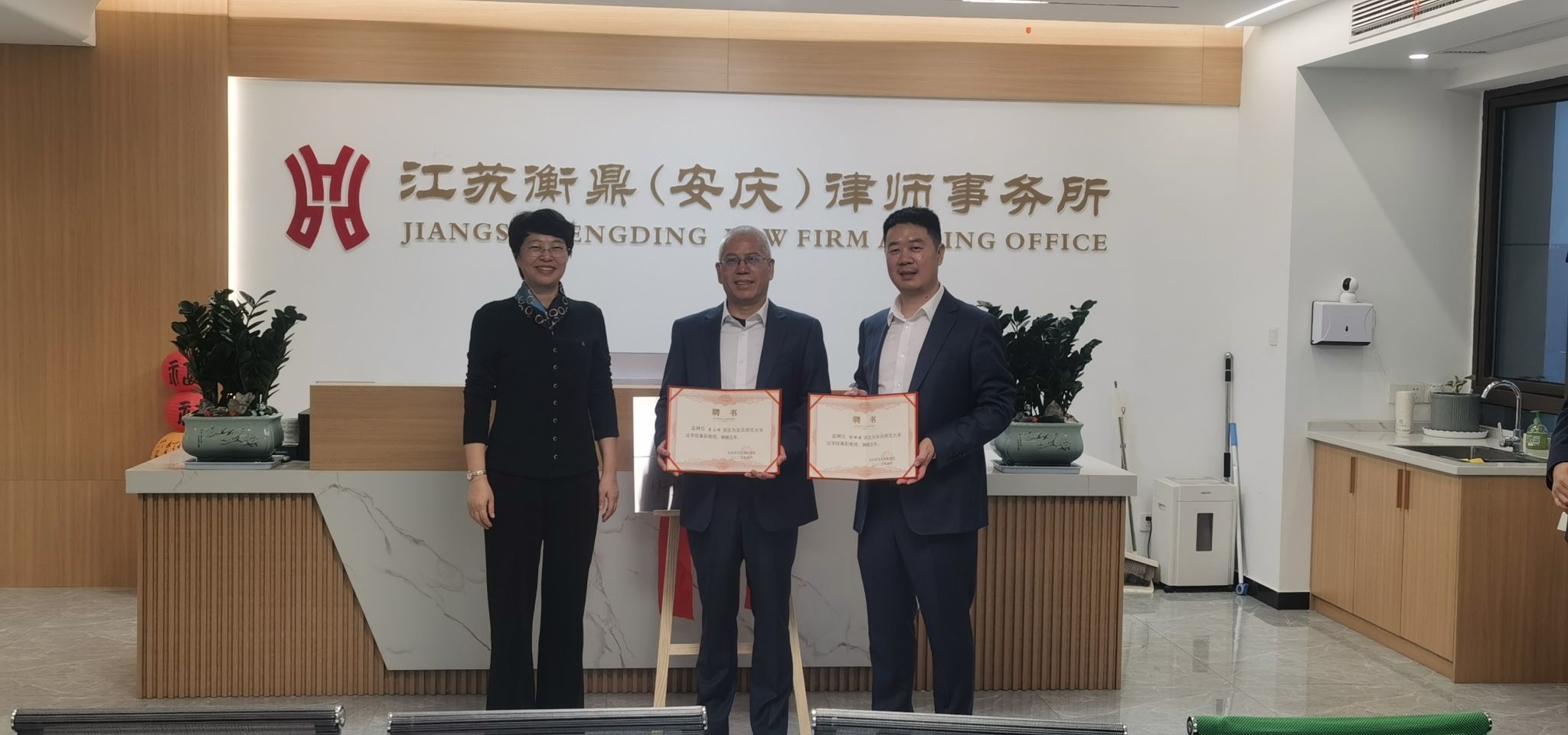 随后,141jj 与江苏衡鼎(安庆)律师事务所签订毕业生就业基地共建协议并举行授牌仪式,标志着双方在毕业生就业创业、实习实践等方面的合作正式落地;同时为律所两位高级合伙人颁发141jj 兼职教授聘书,为实务专家走进课堂、深化教学改革奠定了坚实基础。