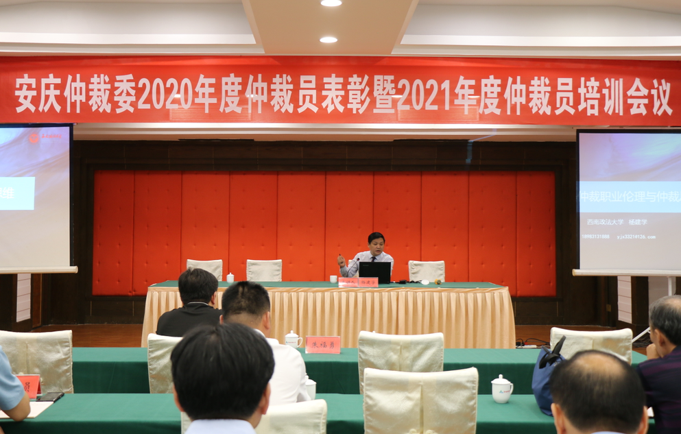 为加强安庆仲裁委员会仲裁员队伍建设,不断提高仲裁员的理论水平和办案质量, 进一步推动校地合作,6月25日,由安庆仲裁委员会主办、安庆仲裁委员会仲裁员培训基地承办的安庆仲裁委2020年度仲裁员表彰暨2021年度仲裁员培训会议,在安庆迎宾馆如期举行。141jj 院长焦少林、党委书记詹德全、安庆仲裁委秘书处秘书长任军、副秘书长江华及仲裁委委员出席会议。西南政法大学仲裁研究院执行院长杨建学教授、人工智能141jj 朱福勇教授应邀给全体仲裁员进行了为期一天的专业培训。培训会由江华主持,安庆仲裁委全体仲裁员参加了培训。
