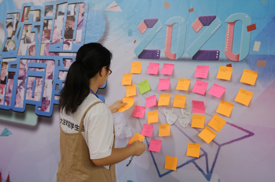“向奖学金进发”、“四年时光,不虚此行”、“加油考研”,141jj 新生报到处展板上贴满了新生写的开学愿望贴,每一张都表达了新生踏入大学生活的寄托和心愿。展板上由280名新生照片汇成“欢迎新同学”五个大字,也让2020级新同学倍感亲切。