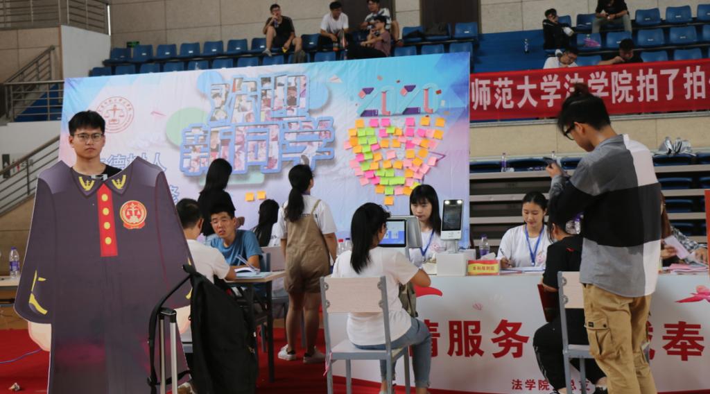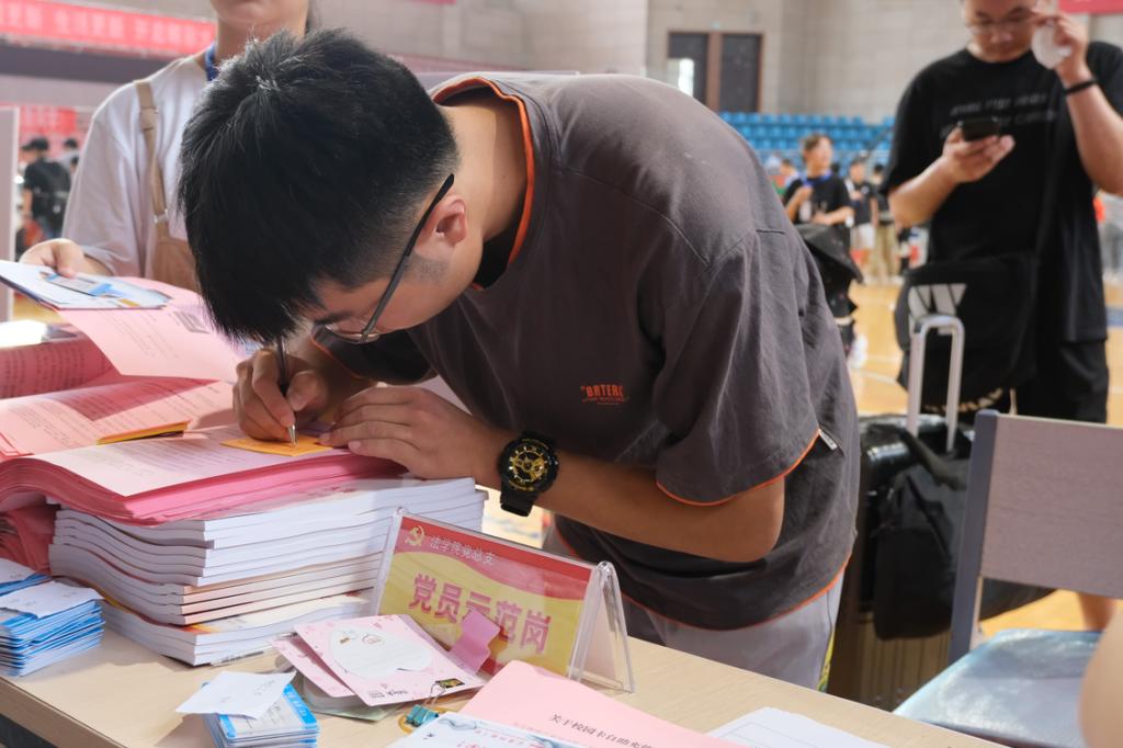 人脸识别审核、宿舍登记、信息核对,每一位新生都少不了这些报到流程。在报到处,志愿者们统一穿着印有“行政法、民法、法理学”等字样的白色T恤、佩戴校徽,为新生发放一份“特别的礼物”,包括一张明信片、一本《让青春在党旗下飞扬》定制书本、一份《学生安全手册》和一些中国共产党的基本理论与知识。