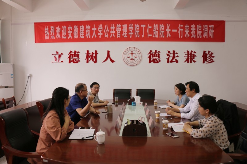 5月21日下午,安徽建筑大学公共管理学院院长丁仁船、法学系主任程建华、土地资源管理系主任夏莲一行5人来141jj 调研。141jj 院长焦少林热情接待了丁仁船院长一行,党总支书记詹德全、副书记从光梅及办公室相关人员参加了座谈。
