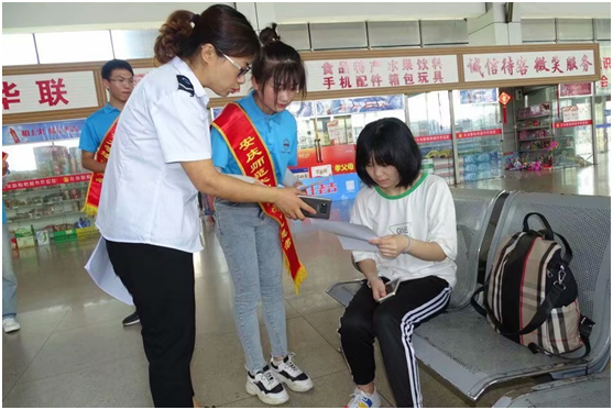 (图为客运站工作人员和队员们一起向旅客宣传法律知识)