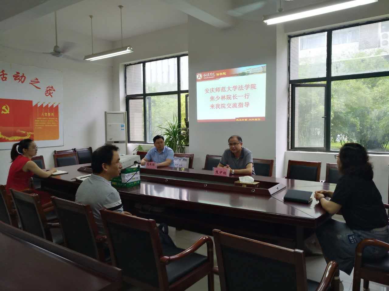 当日上午,焦院长一行与铜陵学院141jj 党总支副书记、副院长杨晚丽和有关老师交流了两院法学专业、知识产权专业建设情况,调研了铜陵学院141jj 在今年5月底接受本科教学工作审核评估做法和经验,介绍了141jj 2019年硕士学位招生情况,特别是法律硕士专业学位和马克思主义法学理论与法治实践学术型硕士研究生招生情况。