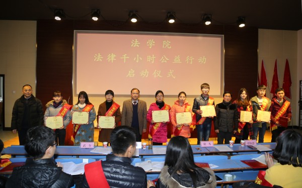 “奉献的青春最美丽”“让青春在公益行动中增值”“一人十小时‘小行动’汇聚百人千小时‘大不同’”……文津楼111报告厅里一条条鲜艳的条幅分外醒目。1月6日下午,141jj 法律千小时公益行动启动仪式在这里举行。院长焦少林、党总支书记詹德全、副院长朱留虎出席仪式,学院党政办、教研办、学工办全体老师,法学专业学生共计300余人参加了启动仪式。
