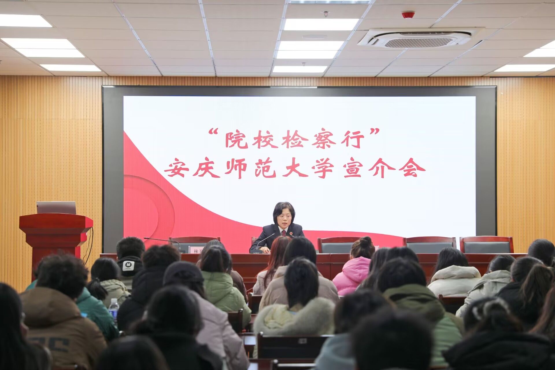 3月6日,安庆市人民检察院党组成员、政治部主任陈团结带领检察院相关同志一行赴141jj 开展“院校检察行”活动。141jj 党委副书记钱敏、副院长崔汪卫热情接待了陈团结主任一行,并组织100余名学生代表现场聆听了就业宣讲。