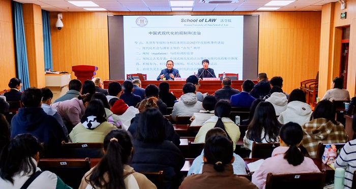 12月2日,著名法学家、《法学家》主编兼社长史际春教授应邀来校作题为“中国式现代化的规制和法治”的学术报告。校长彭凤莲主持报告会,141jj 负责人、部分师生和律师200余人聆听报告。