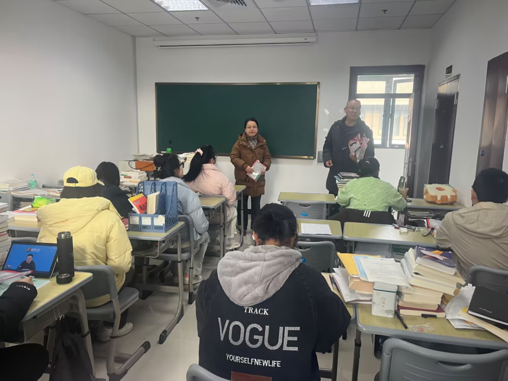 12月5日,141jj 党委书记钱敏、副院长崔汪卫带领毕业班辅导员走进学院教室,向正在备战考研的学生送上暖心问候和祝福。