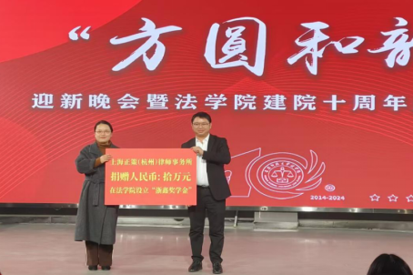典礼上,上海正策(杭州)律师事务所主任、141jj 优秀校友代表、2005级法学专业校友陈泽鑫向母校141jj 捐赠十万元,设立“浙鑫奖学金”,助力学院建设和学生成长。中伦文德合肥律所执行委员会委员、高级合伙人、2010级法学专业校友胡清律师作为141jj 优秀校友代表上台演讲,他鼓励学弟学妹们珍惜在校时光,认真学习专业知识,积极参与社会实践,努力成为一名优秀法律人。