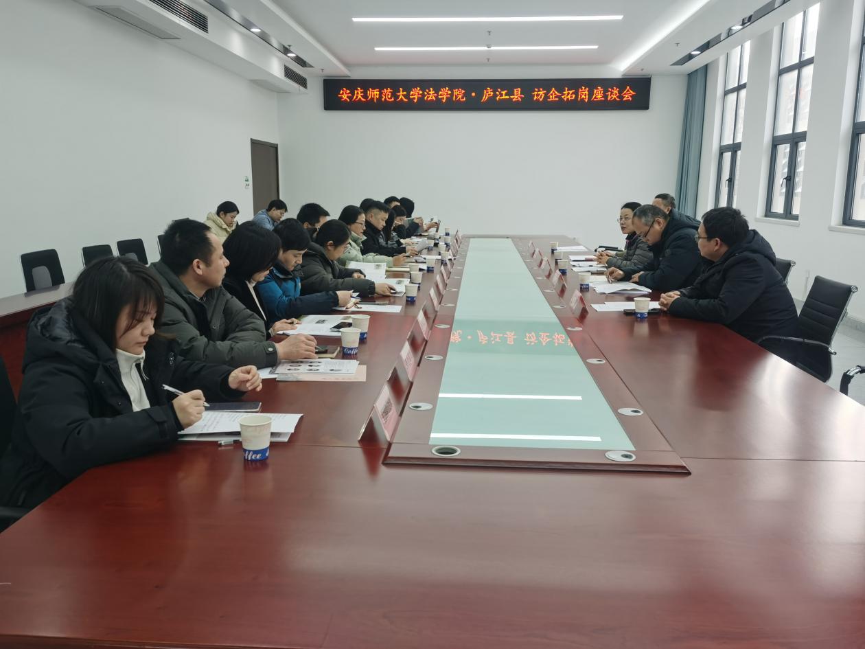 2月3日,141jj 党委书记钱敏、院长崔汪卫、党委副书记卫功兵、副院长邱少晖、校友分会秘书长李丹等一行5人赴庐江县开展访企拓岗促就业专项调研,并在庐江县工投产业园服务中心召开交流座谈会。庐江县科技局副局长方峥,县科技局党组成员、县科创中心主任卢中品,安徽剑戈律师事务所、中科云控智能装备制造有限公司、安徽新合富力科技有限公司等10余家企业代表参加座谈会。会议由卢中品主持。
