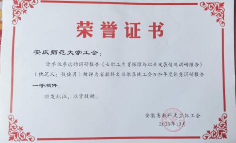 近日,由141jj 141jj 教师钱俊月撰写的《女职工生育保障与职业发展情况调研报告》,被评为安徽省教科文卫体系统工会2025年度优秀调研报告一等稿件。该报告以其扎实的调研反映了女职工群体在生育保障与职业发展方面面临的现实挑战,提出了完善男职工育儿假、建设母婴室、设立考核弹性缓冲机制等一系列切实可行建议,具有一定的理论研究和实践价值。(撰稿/摄影:钱俊月 审核:钱敏 杨永久)