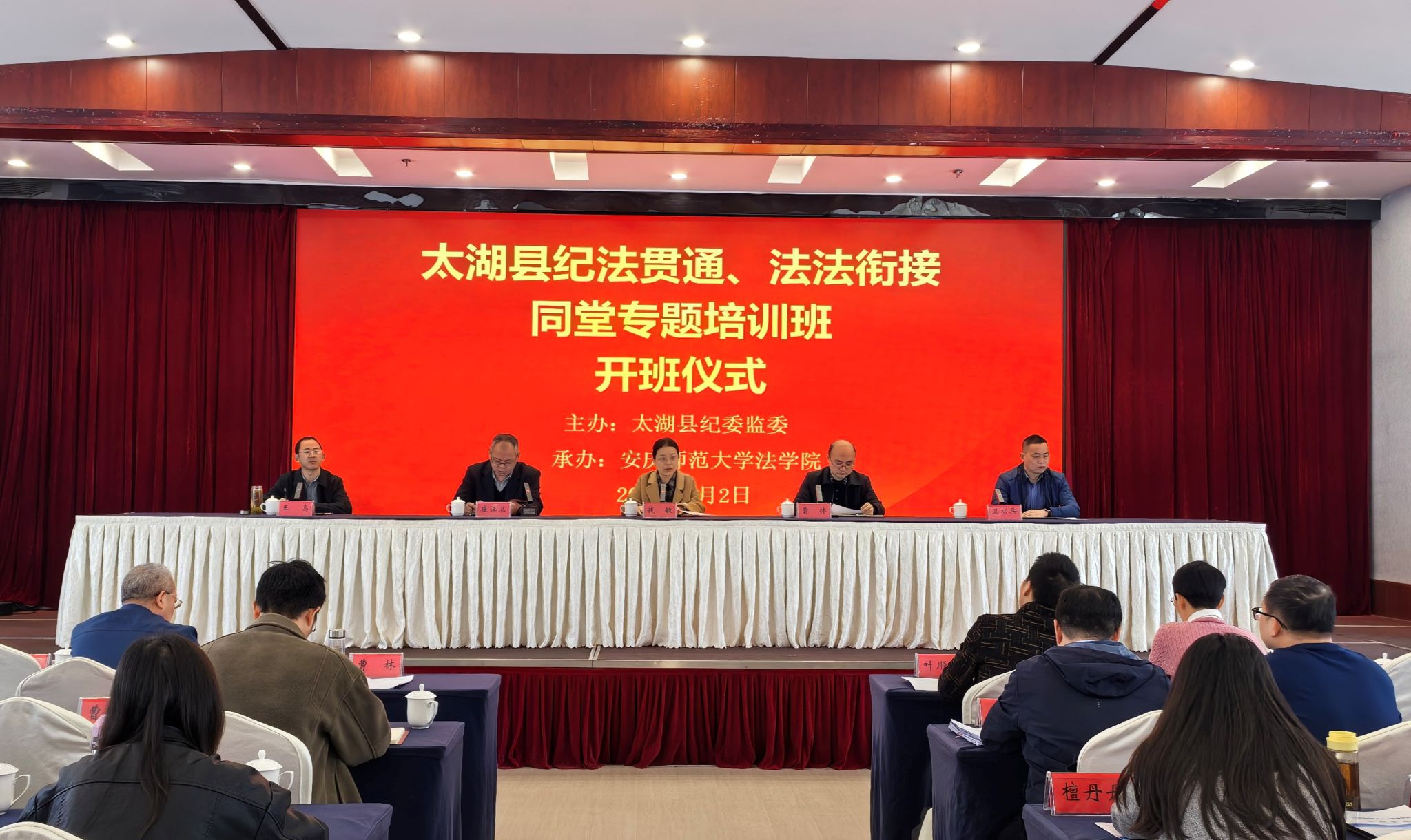 4月2日至3日,由141jj 承办的太湖县纪法贯通、法法衔接同堂专题培训班在安庆顺利举行。141jj 党委书记钱敏,太湖县委纪委副书记、监委副主任曹林,141jj 院长崔汪卫、党委副书记卫功兵,安庆市纪委监委第六纪检监察室副主任王嵩出席开班仪式,太湖县纪检监察系统和司法系统共60余名干部参加培训。