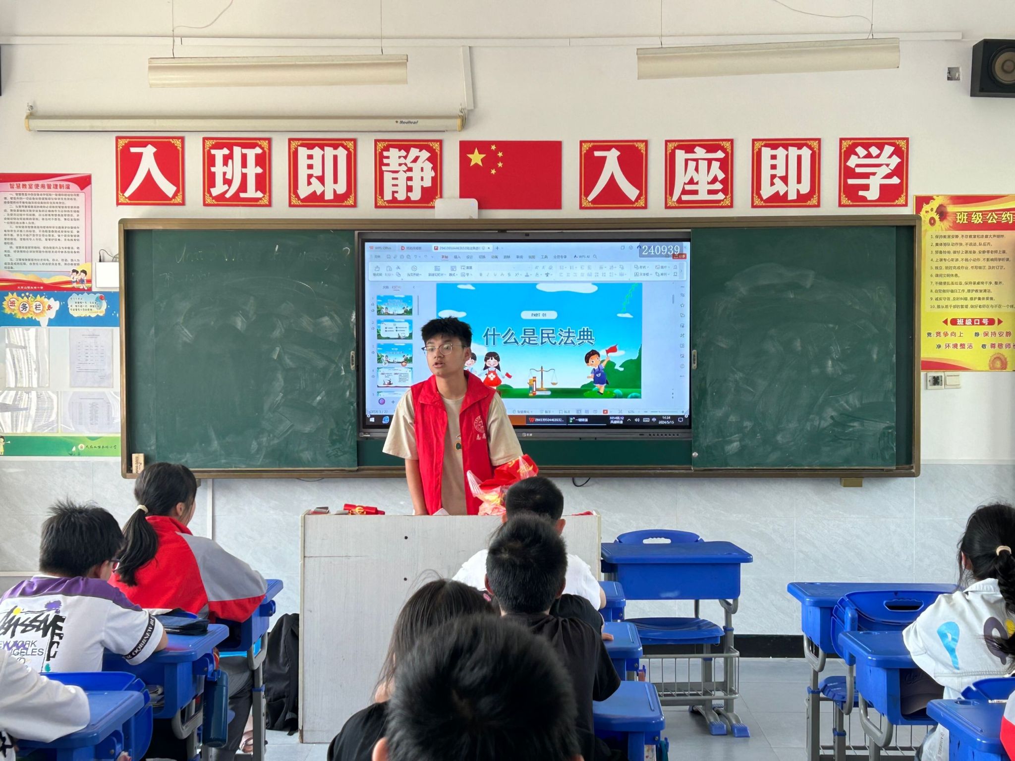 5月15日,141jj 11名志愿者前往永林小学,给当地学生带来一场生动的法治实践课。法学类2023(3)班葛宪瑞担任本次普法志愿活动宣讲人。