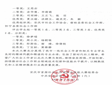 本次大赛由安庆市委社会工作部联合141jj 、市教育体育局、市民政局等共11家单位共同主办,设职工组和学生组两个竞赛组别。141jj 承办了141jj 学生组的选拔与参赛组织工作。经过严格的资格审核、理论知识考核与现场实操技能演示,141jj 徐梦瑶同学荣获一等奖;周小双、杨朝银同学荣获二等奖;郎斯佳、谢婧、徐倩枝同学荣获三等奖;丁宝妍、黄雅静同学获得优秀奖。其中,学生组前三名选手徐梦瑶、周小双、杨朝银将代表141jj 参加于6月17日在安徽师范大学举行的首届安徽省社会工作者职业技能大赛决赛。