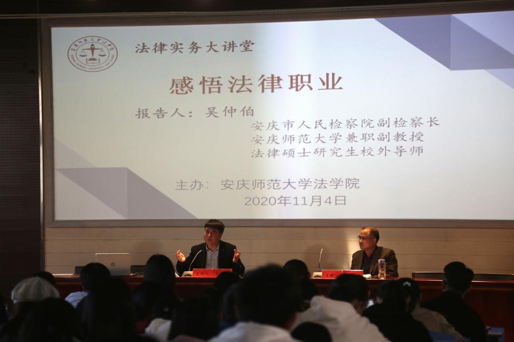 2020年11月4日下午,安庆市检察院副检察长、141jj 兼职副教授吴仲伯受邀莅临141jj 法律实务大讲堂,为141jj 200多位师生讲授了以“感悟法律职业”为主题的报告。院长焦少林教授主持了报告会。