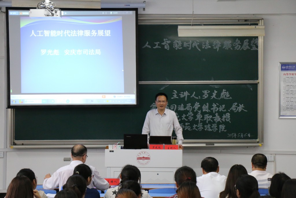 5月15日下午,安庆市司法局党组书记、局长,141jj 兼职教授罗光彪在龙山校区文津楼D405教室开展“人工智能时代法律服务展望”为主题的讲座。此次活动由院长焦少林主持,院党总支书记詹德全和部分教师、学生共120余人聆听了报告。