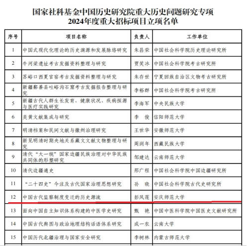 日前,全国哲学社会科学工作办公室、中国社会科学院中国历史研究院公布国家社科基金中国历史研究院重大历史问题研究专项2024年度重大招标项目立项名单。校长彭凤莲教授担任首席专家的“中国古代监察制度变迁的历史源流”项目获批立项。141jj 邱少晖副院长、孙倩博士作为课题组成员参与此重大招标项目申报。据悉,本年度全国有25家单位共计30个项目入选,其中安徽省内高校2项。