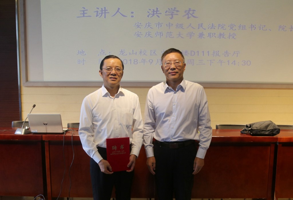 报告会开始前,校长闵永新教授会见了洪学农院长,向其颁发了141jj 兼职教授聘书,并对洪院长及安庆市法院系统长期关心和支持141jj 特别是141jj 的建设表示衷心地感谢。洪院长在授受聘任后表示,要认真履行兼职教授职责,在工作之余为141jj 的专业学科建设多做贡献。闵校长和洪院长还就进一步加强141jj 和安庆市法院系统合作交换了意见。
