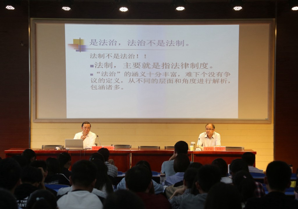 洪院长的报告主要从法治理论与法治实践两个侧面展开,娓娓道来,引人入胜。首先,从学理上深刻阐释法治的概念、内涵与特征。他对“法治是什么,到底是什么”进行了理论追问,并指出法治不是法制,法治是现代政治文明的核心;法治是有品质国家富强、民主、文明、和谐与现代化等国家特质的集中体现;社会主义法治以人民为中心,应充分保障人权。他推崇亚里士多德的观点,并赞同金斯伯格的反对法本身的不法成为法治的内容。其次,在法治实践中积极探寻法治与德治、立法与自治以及法治与治理之间内在的逻辑勾连。他认为,“法无明文规定即可为”是一种误读,因为仍需进行道德上的考量。立法可能因与实际不契合而不科学,乡规民约类的社会组织自治则最切合实际。公正司法应忠于客观事实的真相等。再次,洪院长还结合自身工作实际,谈了几点自己对法治与法治实践的深刻感受,他重点指出,在司法实践中,法院要像法院,要以审判为职业,追求程序和实体正义,注重庄重与敬慑;法官要像法官,需做到公正、智慧、担当与协和;律师则要做到规范执业和诚信服务等。