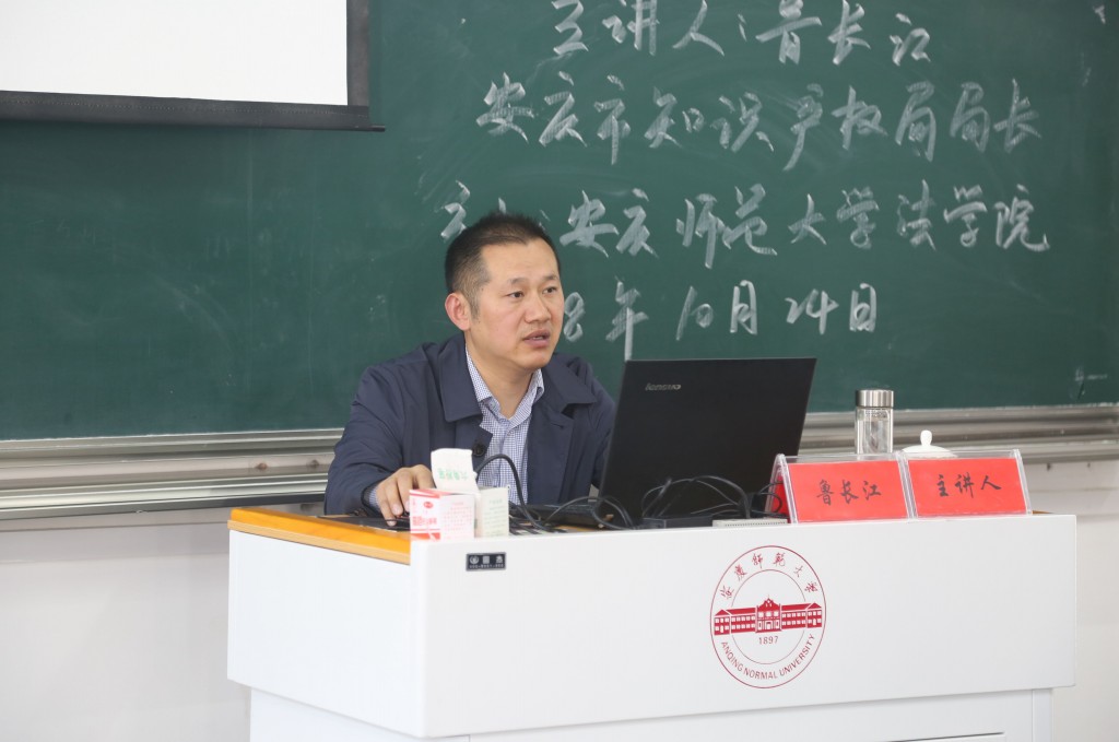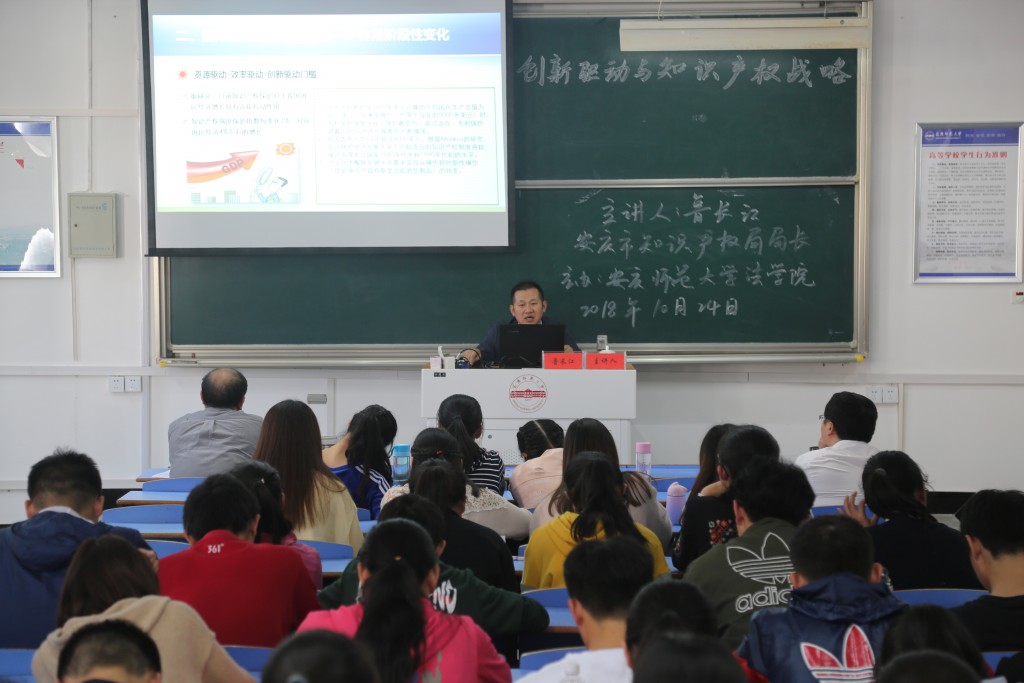 2018年10月24日下午在龙山校区文津楼D405教室,安庆市知识产权局局长鲁长江受邀作客法律实务大讲堂,以“创新驱动与知识产权战略”为题作专题报告。141jj 院长焦少林教授主持报告会,141jj 部分教师和2017级、2018级知识产权与法学专业学生120余人聆听了报告。