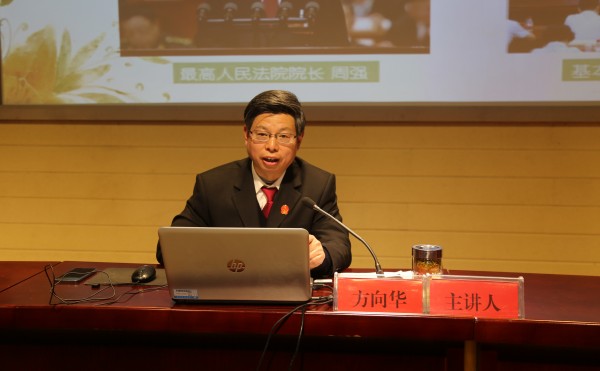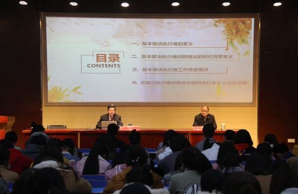 11月22日安庆市中级人民法院副院长,141jj 兼职副教授方向华应邀莅临法律实务大讲堂,以“‘基本解决执行难’与中国法治进程”为题作报告。141jj 教师和法学专业部分学生参加了报告会,141jj 院长焦少林教授主持报告会。