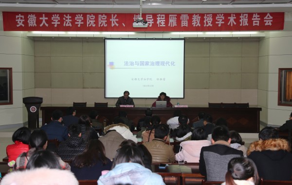 12月11日,教育部法学类专业教指委、安徽大学141jj 院长、博导程雁雷教授应邀来141jj 作 “法治与国家治理现代化”的专题报告会。141jj 全体教师和部分法学专业学生参加了报告会,报告会由141jj 院长焦少林教授主持。