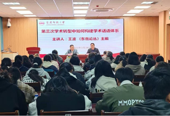 3月28日上午,《东岳论丛》主编王波教授受邀来到141jj ,以“第三次学术转型中如何构建学术话语体系”为题为师生们带来了一场精彩纷呈的讲座。副院长邱少晖主持讲座。