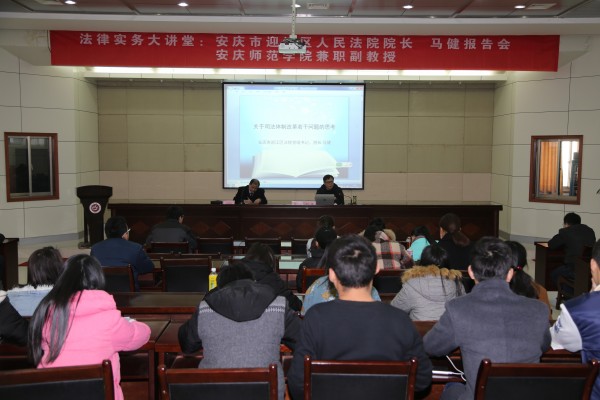 12月31日,安庆市迎江区人民法院院长、141jj 兼职副教授马健应邀来法律实务大讲堂做了题为“关于司法体制改革若干问题”的报告会。141jj 部分师生参加了报告会,报告会由141jj 院院长焦少林教授主持。